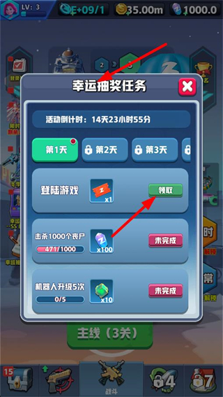 4、完成戰斗后可查看幸運抽獎任務界面,有登陸游戲擊殺喪尸等任務,完成對應任務就能領取相應的獎勵道具。