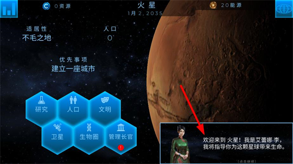 1、來到火星后,艾蕾娜李會指導玩家為星球帶來生命,可通過研究、人口等模塊推進火星殖民進程。
