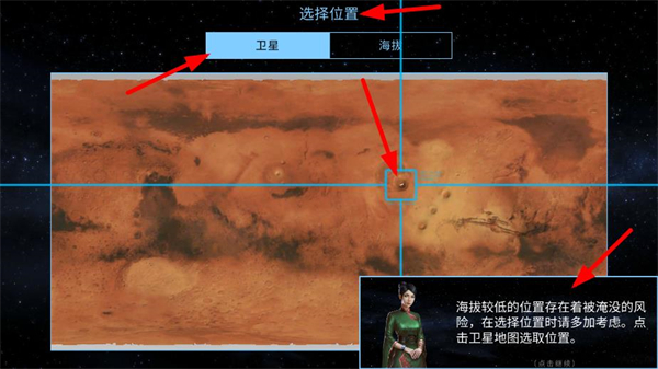 3、選擇城市位置時,可通過衛星地圖查看,注意海拔較低位置有被淹沒風險,挑選合適地點建設城市。