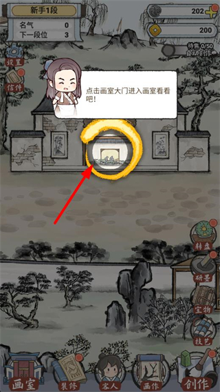 1、點擊畫室大門進入畫室,開啟水墨畫作創作之旅,逐步解鎖畫室功能,提升名氣和段位。