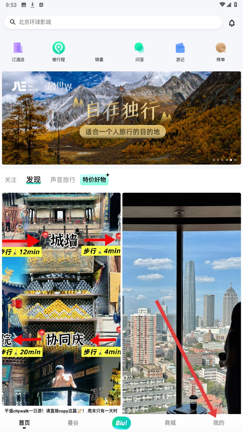 1、進入首頁,可使用訂酒店、做行程、錦囊等功能,還能瀏覽發現板塊的旅行內容,如適合一個人旅行的目的地推薦、平遙citywalk一日游攻略等。