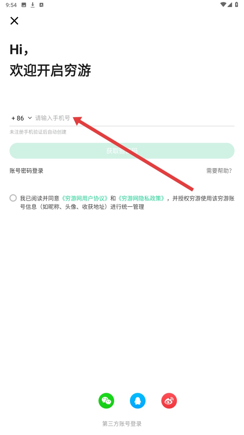3、登錄界面,可輸入手機號獲取驗證碼登錄,也可選擇賬號密碼登錄或第三方賬號如微信、QQ、微博登錄,勾選同意協議后即可開啟窮游之旅。