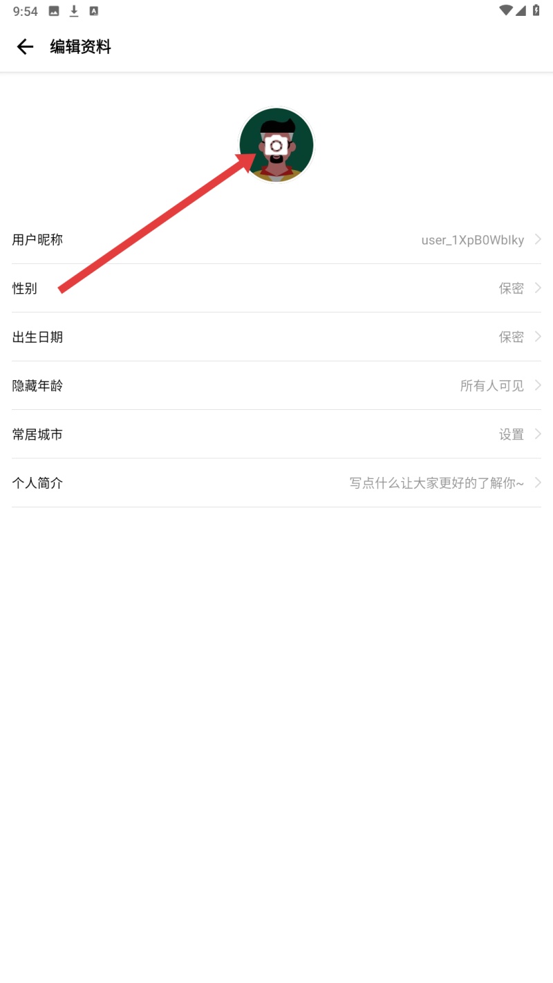 4、登錄后可進入編輯資料頁面,可修改頭像、用戶昵稱、性別、出生日期等信息,設置常居城市和個人簡介,完善個人資料。