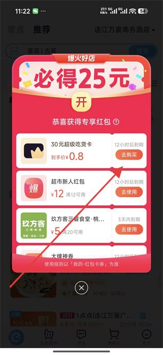 1、進入外賣軟件可看到爆火好店必得25元的專享紅包彈窗,其中有30元超級吃貨卡等優惠,點擊去購買進入購買頁面。