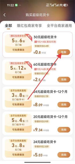 2、在購買超級吃貨卡頁面可選擇不同面額和類型的吃貨卡,如30元超級吃貨卡點擊搶購。