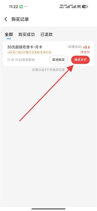 3、在購買記錄頁面可看到待支付的30元超級吃貨卡,點擊繼續支付進入收銀臺頁面,選擇支付方式。