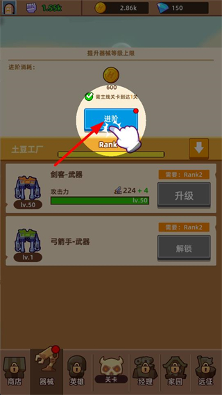 4、在提升器械等級的界面,花費600金幣點擊進階按鈕,可提升土豆工廠的等級,解鎖更多功能助力戰斗。