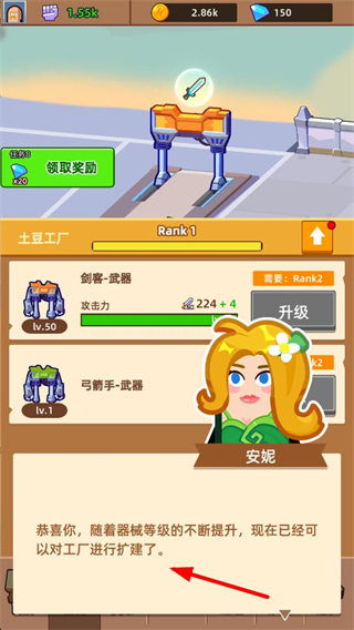 3、隨著器械等級提升,安妮提示可對工廠進行擴建,在土豆工廠界面能看到劍客武器的等級和攻擊力。