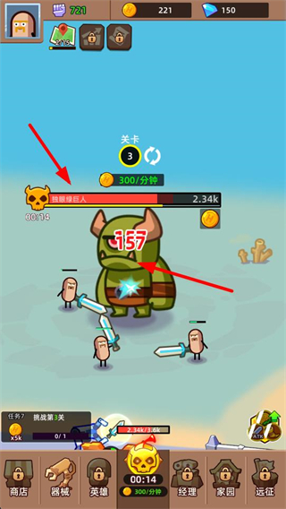 1、進入關卡2后,界面有體型較大的怪物,派出持劍的土豆人攻擊它,還有倒計時和領取獎勵按鈕。
