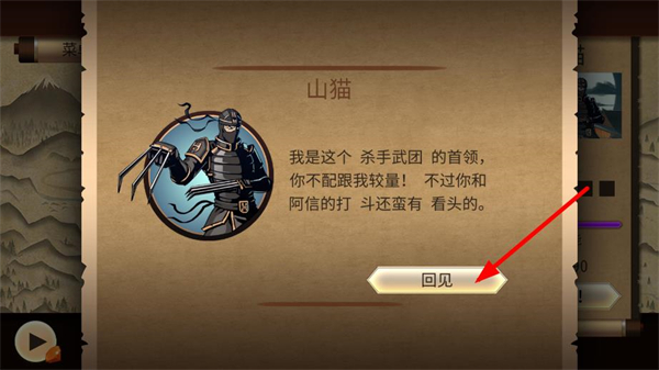 1、查看山貓的對話內容,了解其背景信息后,點擊回見按鈕關閉對話界面,繼續推進游戲流程,開啟新的挑戰。