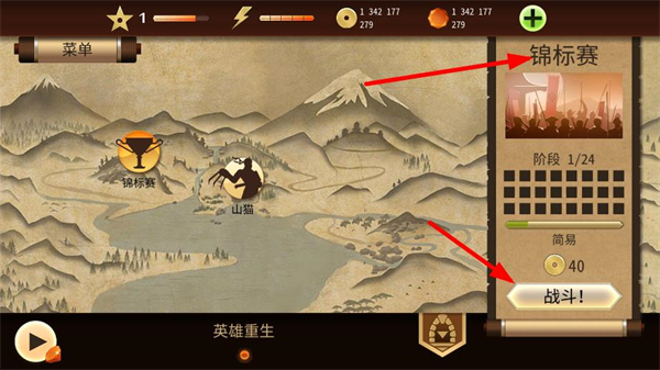 2、進入地圖界面,選擇錦標賽區域,點擊戰斗按鈕消耗貨幣,進入錦標賽的對戰場景,參與競技挑戰提升排名。