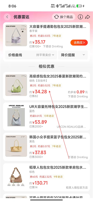 2、在優惠雷達頁面,瀏覽相似優惠的商品列表,選擇心儀的商品,點擊進入該商品的詳情頁面,了解商品款式、價格等內容。