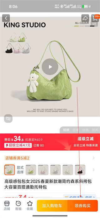 3、進入商品詳情頁,查看商品展示和優惠活動,選擇喜歡的款式和顏色分類,確認商品信息后,準備進行購買。