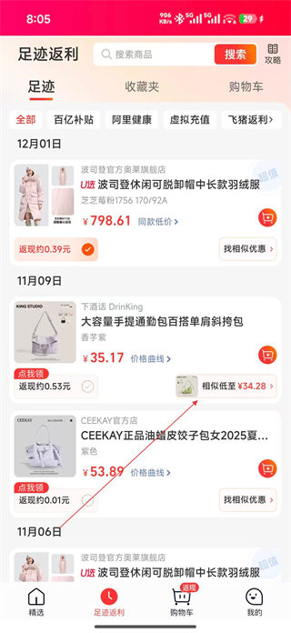 1、打開一淘app,進入足跡頁面,可查看瀏覽過的商品記錄,選擇感興趣的商品,點擊相似產品,查看相關優惠信息。