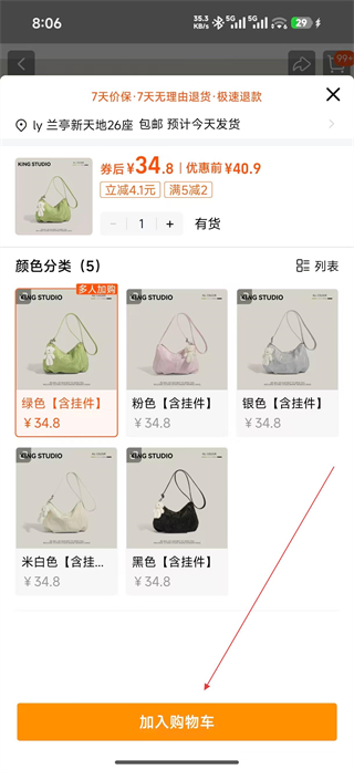 4、在商品規格選擇頁面,選定顏色分類等參數,點擊加入購物車按鈕,將商品添加至購物車。
