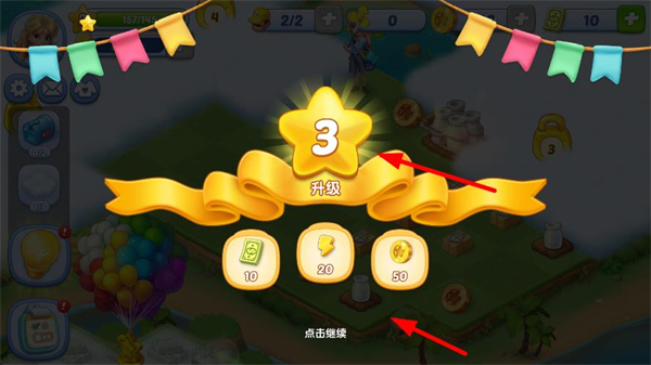 3、完成對應任務后會出現升級提示,界面顯示3星標識和獎勵,點擊繼續按鈕,即可進入后續的環節。