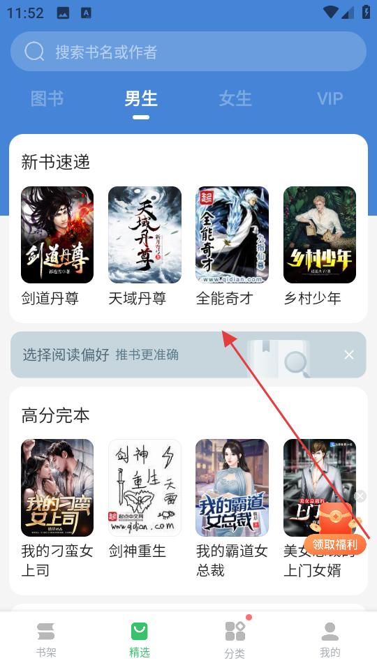 1、進入精選頁面,切換到男生頻道,在新書速遞分區瀏覽劍道丹尊、天域丹尊等書籍封面與標題,挑選感興趣的作品。
