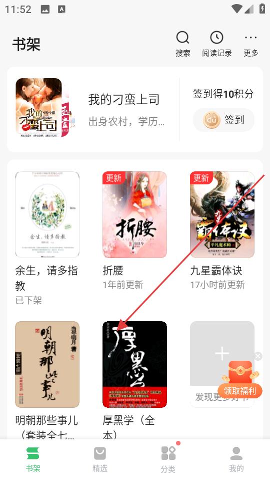 2、點擊底部書架按鈕,進入書架頁面,查看已添加的書籍列表,如我的刁蠻女上司、折腰等,找到想繼續閱讀的書籍點擊進入。