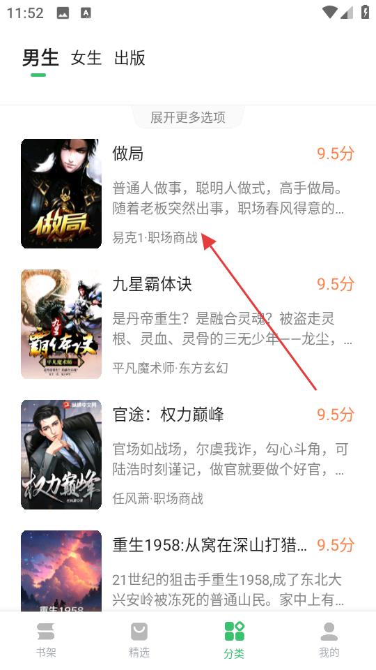 3、切換至分類頁面,選擇男生分類,瀏覽做局、九星霸體訣等書籍介紹,根據簡介和評分,挑選心儀的小說開始閱讀。