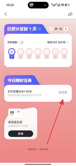 4、在簽到頁面中找到今日限時任務板塊,點擊去完成,按照任務要求開啟自動備份功能并備份滿10個文件,從而獲取文件容量50M90天的獎勵。