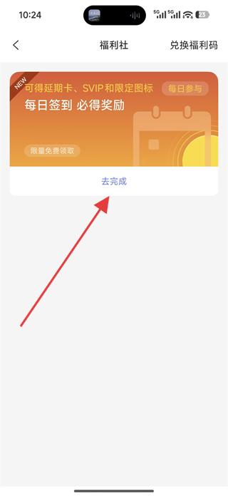 2、進入福利頁面后看到每日簽到必得獎勵的活動入口,點擊去完成,進入到簽到活動的具體頁面。