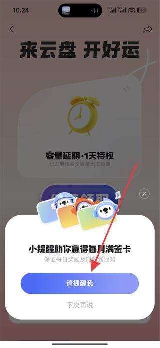 3、在彈出的小提醒助你贏得每月滿簽卡的窗口中,點擊請提醒我,這樣就能保證每日獎勵及活動通知及時送達。