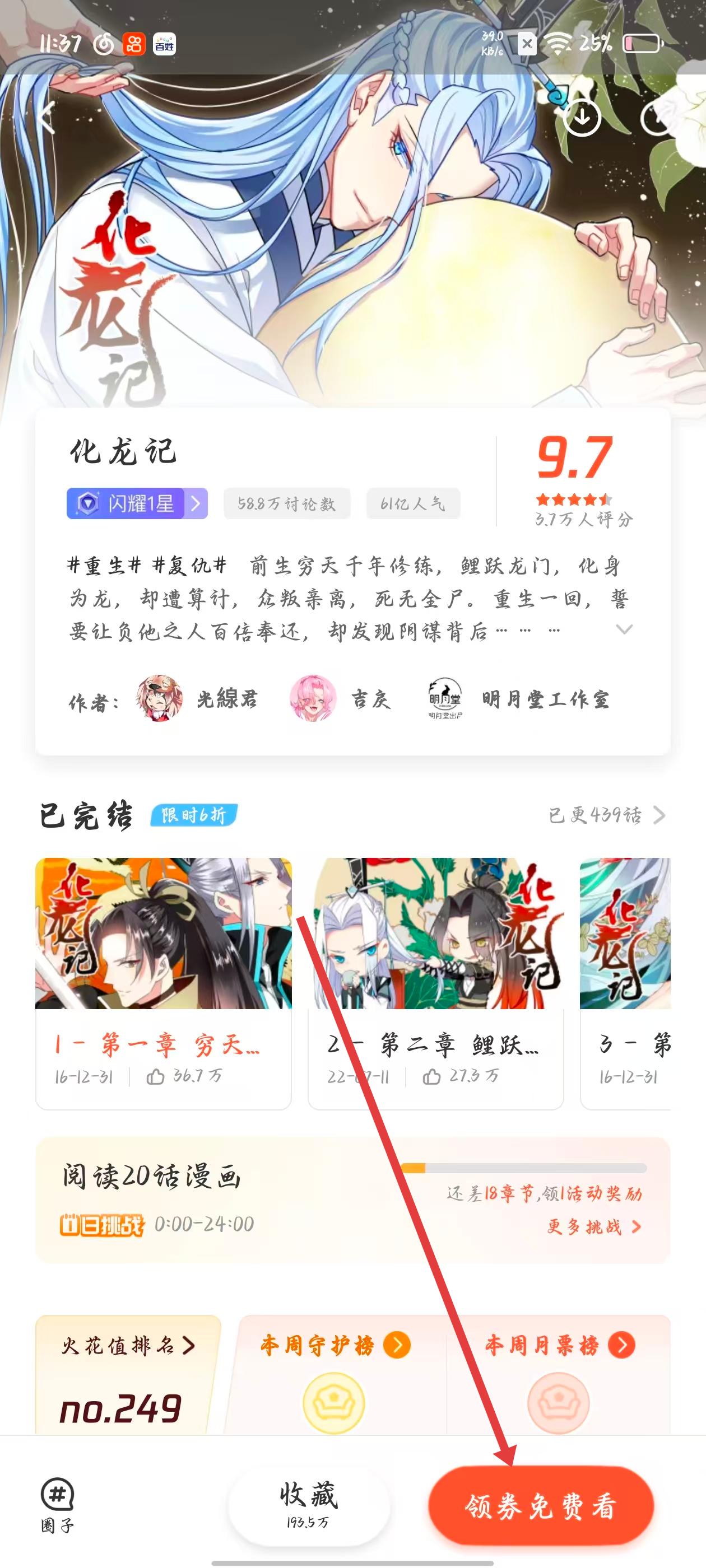 2、在化龍記閱讀頁面,返回漫畫詳情頁,點擊領券免費看,領取借閱券,獲得免費閱讀權限。