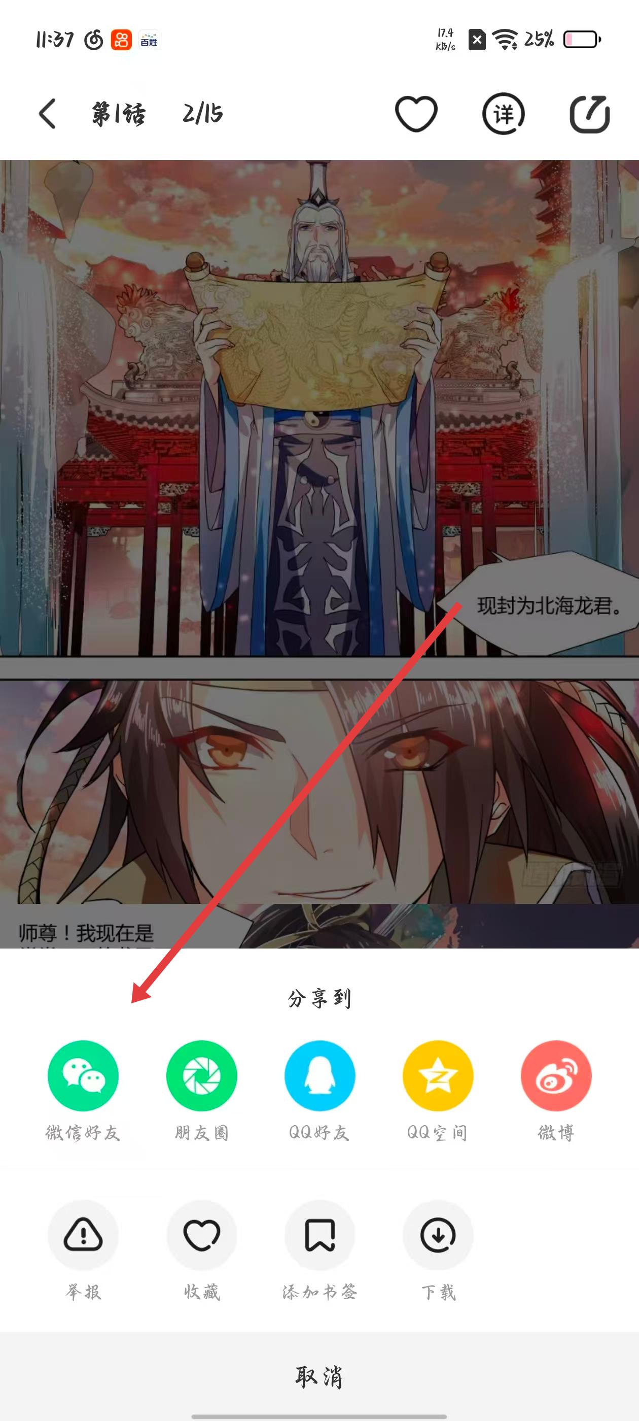 4、在閱讀頁面點擊分享,選擇微信好友、朋友圈等分享渠道,將化龍記漫畫分享給他人。