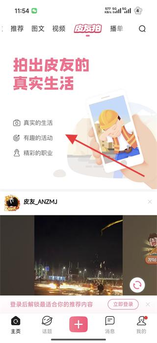 4、點擊皮友拍標簽,進入皮友拍頁面,能看到拍出皮友的真實生活等主題,還有真實的生活、有趣的活動、精彩的職業等分類,可瀏覽皮友分享的相關內容。