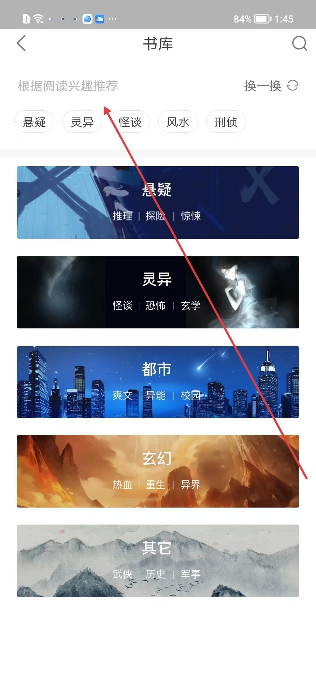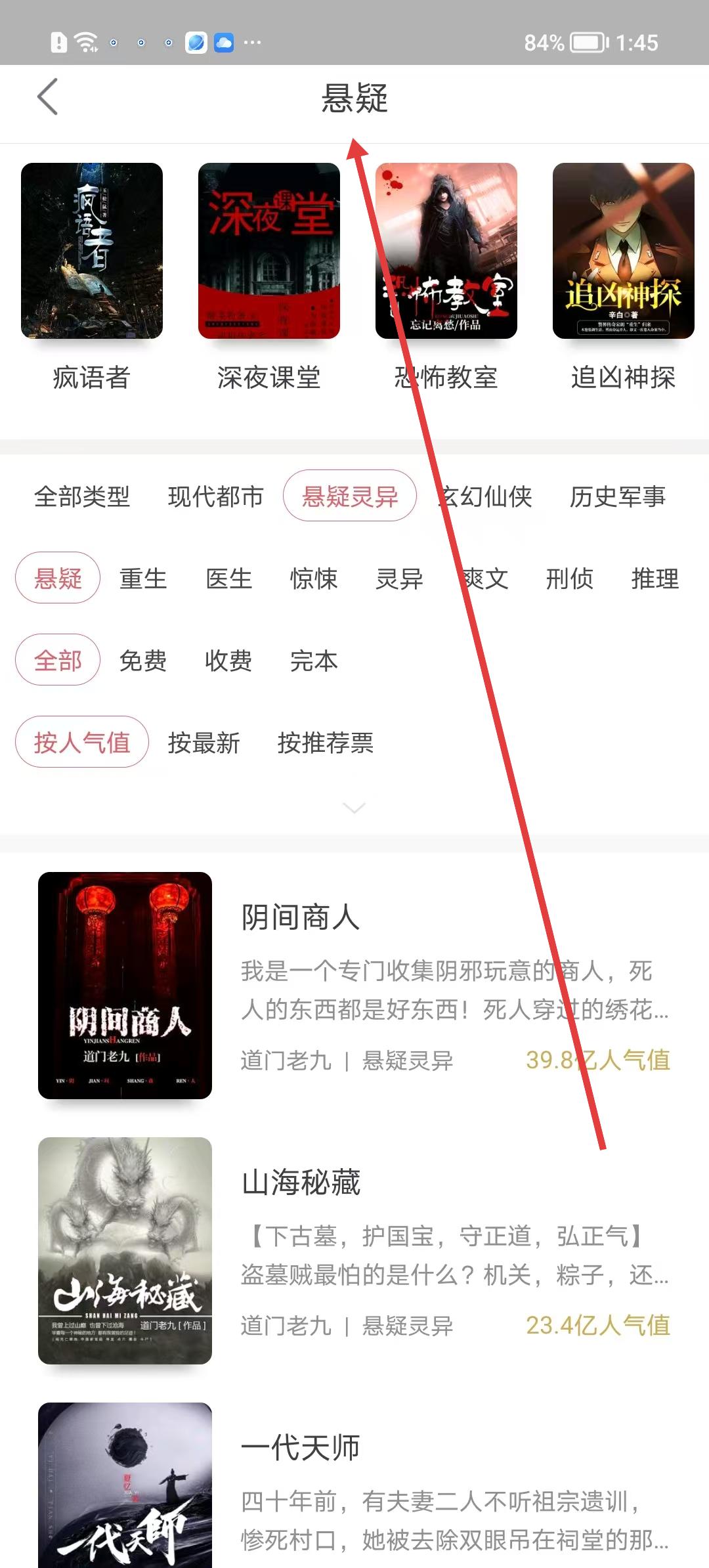 2、進入書庫頁面查看根據閱讀興趣推薦的懸疑、靈異等分類,選擇感興趣的分類,進入小說列表頁面。