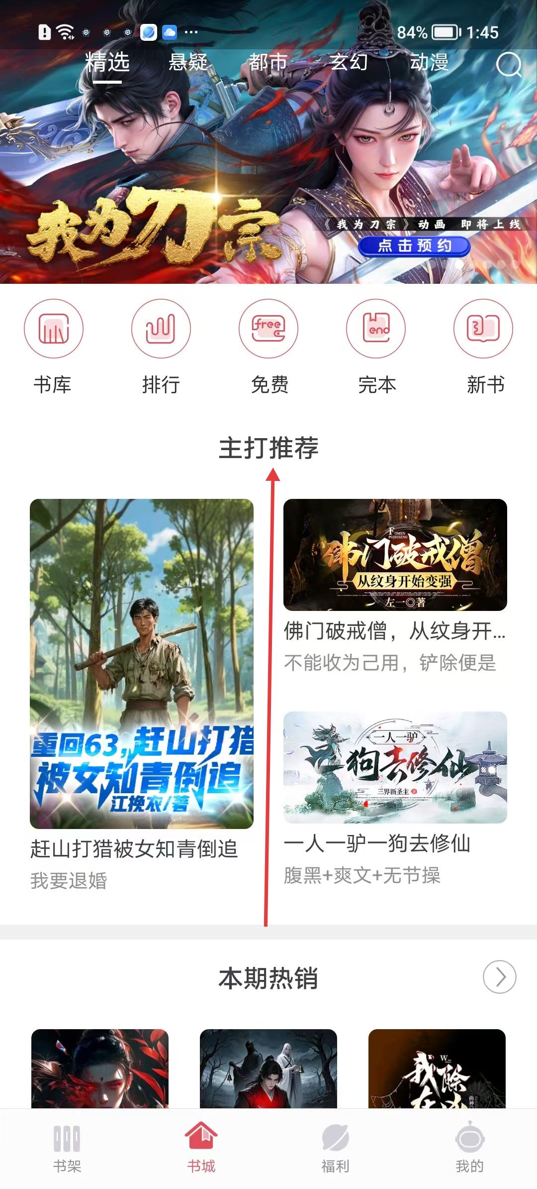 1、進入軟件書城頁面,瀏覽主打推薦和本期熱銷小說,查看趕山打獵被女知青倒追等小說,了解小說類型與推薦情況。