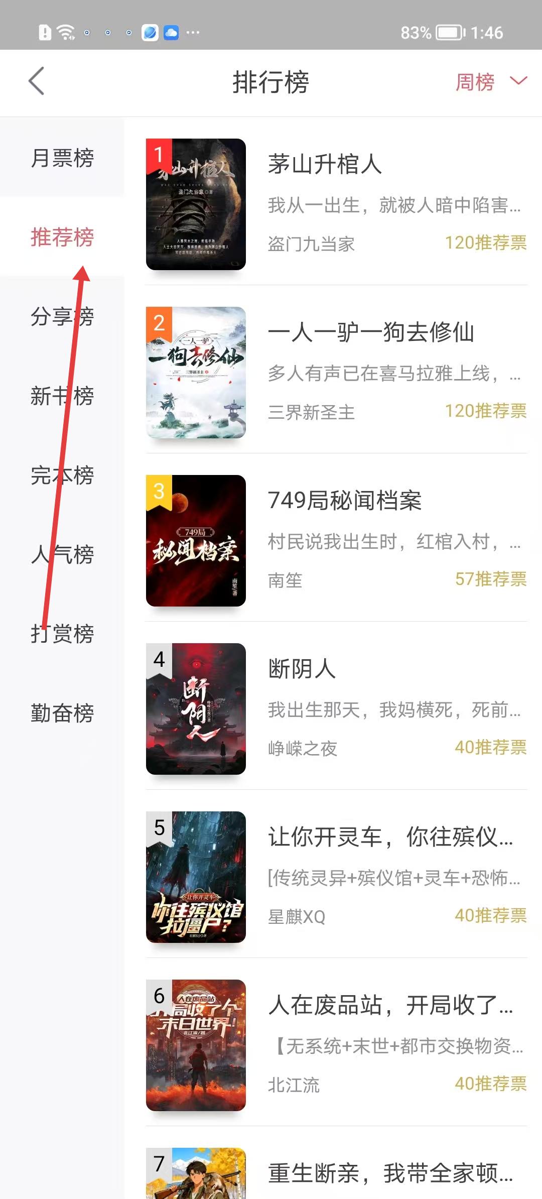 4、進入排行榜頁面查看推薦榜等榜單,了解茅山升棺人等熱門小說的推薦票情況,選擇小說進行閱讀。