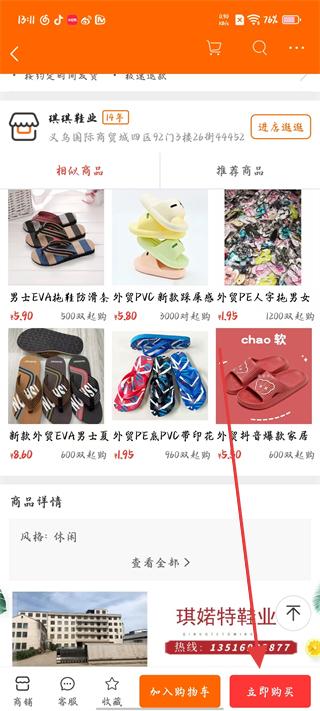 2、在店鋪頁面選擇心儀商品如外貿拖鞋,可查看商品風格、價格等信息,點擊立即購買可進入結算流程,也可加入購物車繼續選購。