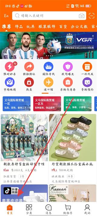 1、進入軟件首頁可瀏覽推薦商品,如新款原神盲盒按動筆、外貿款洞洞樂空調拖鞋等,也可進入店鋪頁面查看相似商品、推薦商品等。