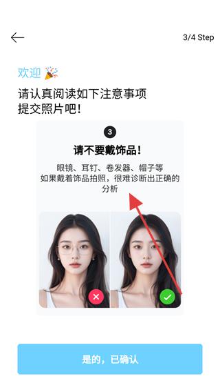 4、然后閱讀第三條注意事項,拍照時請不要戴飾品,像眼鏡、耳釘、卷發器、帽子等都不能戴,因為戴著飾品拍照,很難診斷出正確的分析,確認后點擊是的。