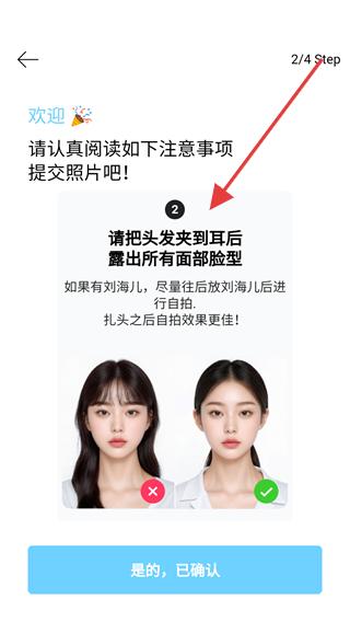 3、接著閱讀第二條注意事項,拍照時請把頭發夾到耳后,露出所有面部臉型,如果有劉海兒,盡量往后放劉海兒后進行自拍,扎頭之后自拍效果更佳,確認后點擊是的。
