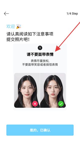 2、首先閱讀第一條注意事項,確保拍照時不要面帶表情,表情盡量放松,不要面帶笑容或者搞怪表情。