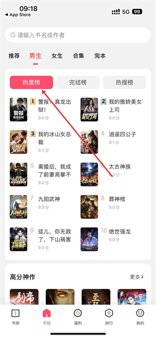 2、在書城頁面可查看推薦、男生、女生等分類,選擇男生分類下的熱度榜,可查看警報,真龍出獄等熱門小說。