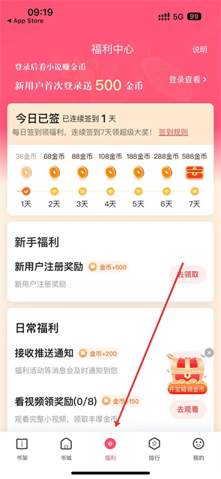 3、進入福利中心頁面可查看今日已簽的簽到福利、新手福利和日常福利,新用戶注冊可領取金幣獎勵,還可看視頻領金幣。