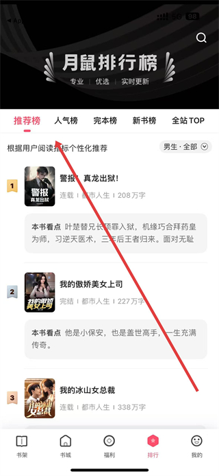 4、在排行頁面可查看月鼠排行榜的推薦榜、人氣榜等,根據用戶閱讀指標個性化推薦小說,如警報真龍出獄、我的傲嬌美女上司等。