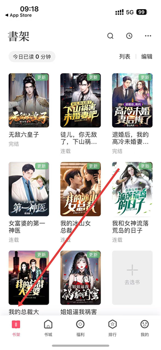 1、進入書架頁面可查看已添加的小說,如無敵六皇子、徒兒,你無敵了,下山禍害吧等,點擊小說可進入閱讀頁面。