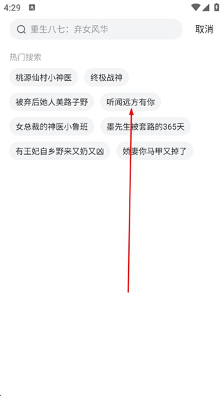 1、打開小說會軟件在搜索欄輸入關鍵詞,可查看熱門搜索推薦,選擇感興趣的小說名稱,點擊進入作品頁面。