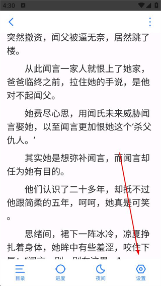4、閱讀過程中可使用進度、夜間、設置等功能,調整閱讀模式和界面參數,提升閱讀體驗,持續瀏覽小說內容。