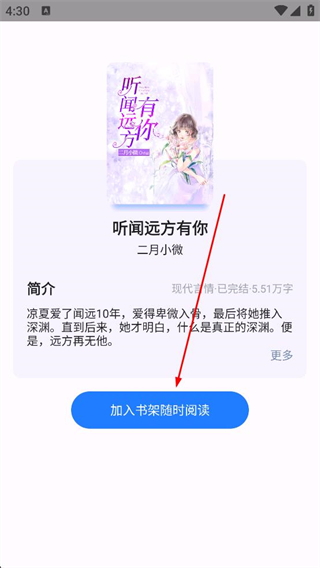 3、在小說詳情頁查看作品簡介了解故事背景,點擊加入書架按鈕,將小說保存至書架。