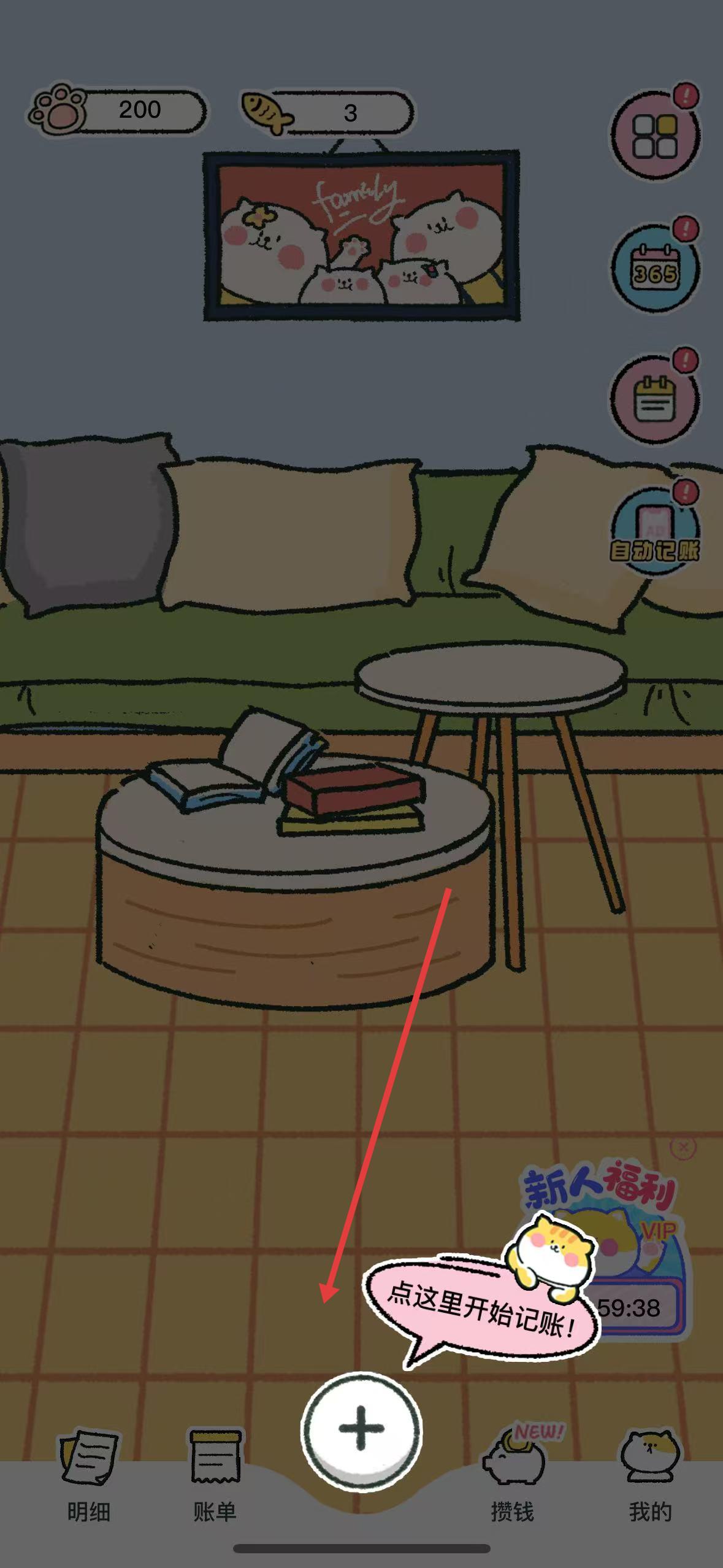 1、應用主界面是溫馨貓咪客廳場景,底部加號按鈕引導開始記賬,界面有小魚、積分等元素,及明細、賬單等功能入口。