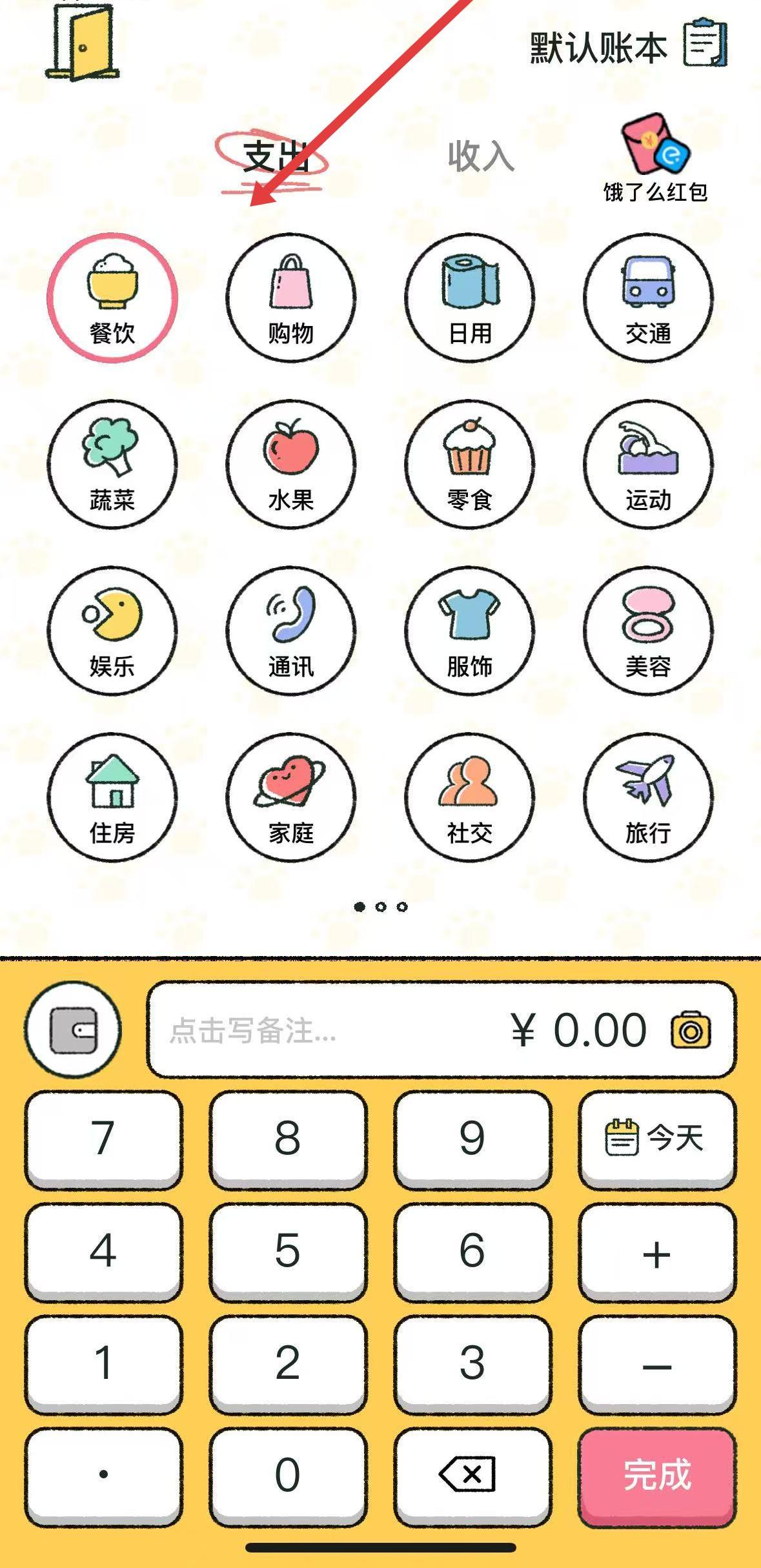 2、記賬頁分支出、收入,支出有餐飲、購物等分類圖標,下方可填備注、金額,完成后點完成記錄。