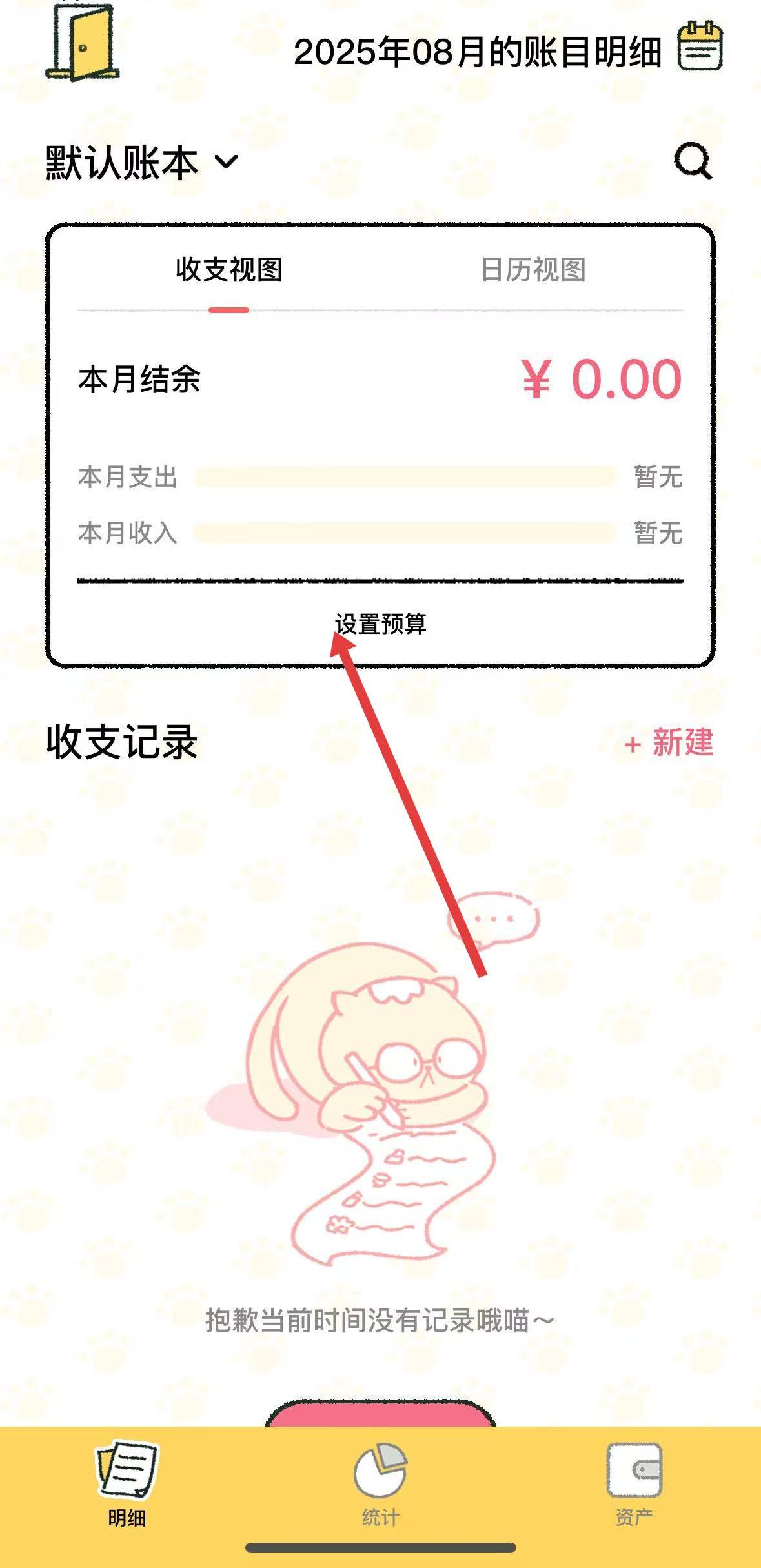 3、賬目明細頁顯示2025年8月收支,本月結余等,可設置預算,無收支記錄時貓咪插畫提示當前無記錄。