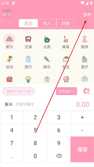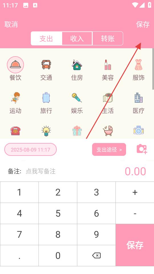 1、進入軟件后點擊記一筆按鈕,進入記賬頁面,選擇支出、收入或轉賬類型,再選擇消費類別,如餐飲、交通、美容等,輸入金額后點擊保存,完成記賬。