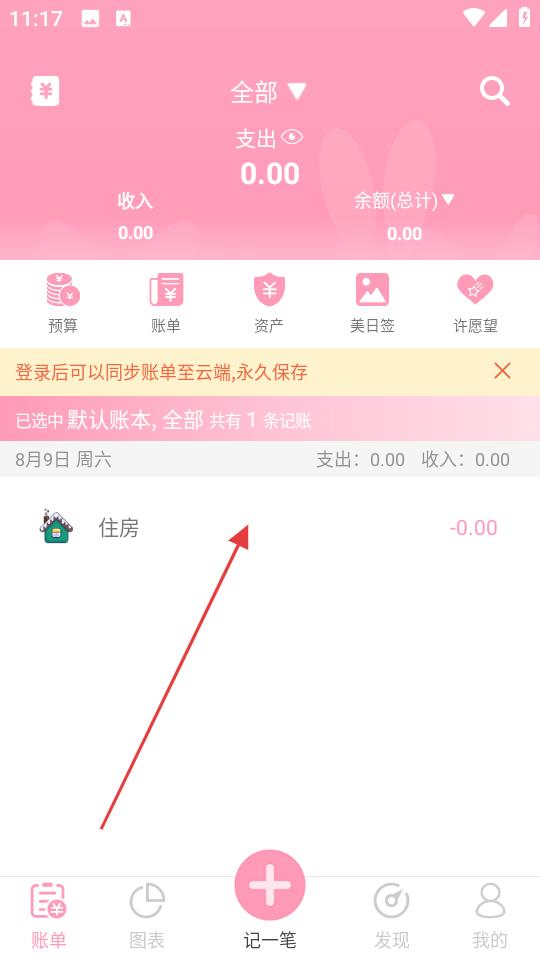 3、在賬單頁點擊記一筆,進入記賬界面,選擇支出收入轉賬類型,挑選住房等消費圖標,填寫金額備注,點擊保存,完成新記賬操作。