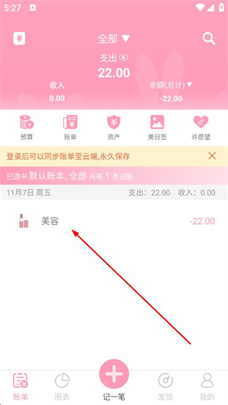 2、在賬單頁面可查看已記錄的賬單,如美容類支出22元,了解收支情況,還能通過圖表板塊查看收支統計,掌握消費趨勢。